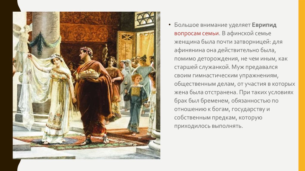 • Большое внимание уделяет Еврипидвопросам семьи. В афинской семье
