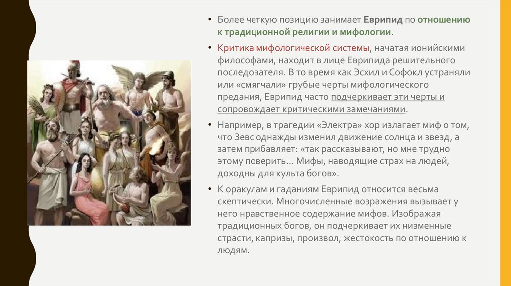 • Более четкую позицию занимает Еврипид по отношениюк традиционной религии и мифологии.