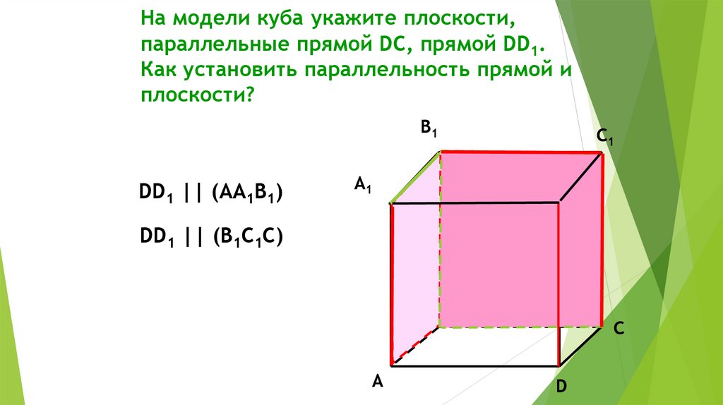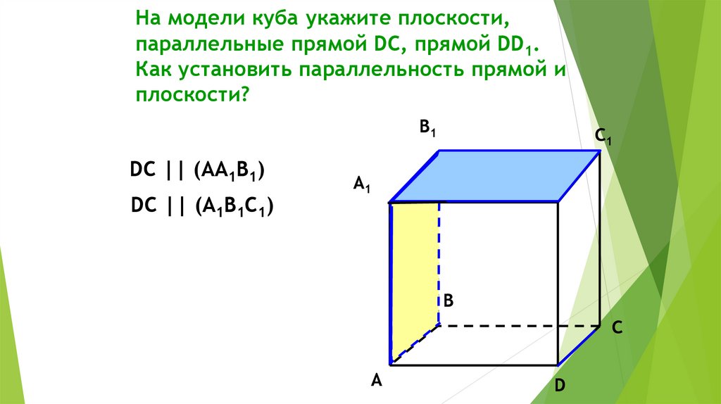 На модели куба укажите плоскости,параллельные прямой DC, прямой DD1.