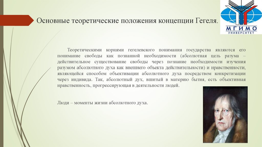 Основные теоретические положения концепции Гегеля.Теоретическими корнями гегелевского понимания государства являются его
