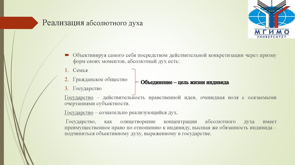 Реализация абсолютного духаОбъективируя самого себя посредством действительной конкретизации через призму