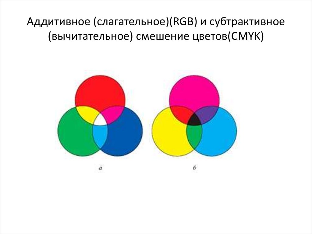 Аддитивное (слагательное)(RGB) и субтрактивное(вычитательное) смешение цветов(СMYK)