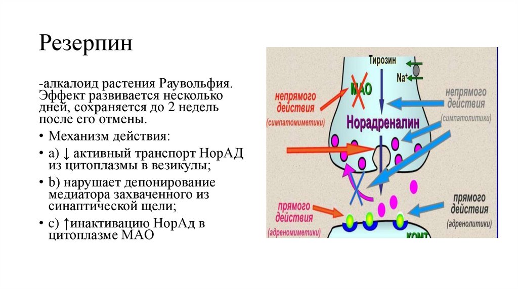 • ЦНС: угнетение, седативный эффект (резерпин)