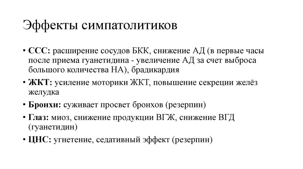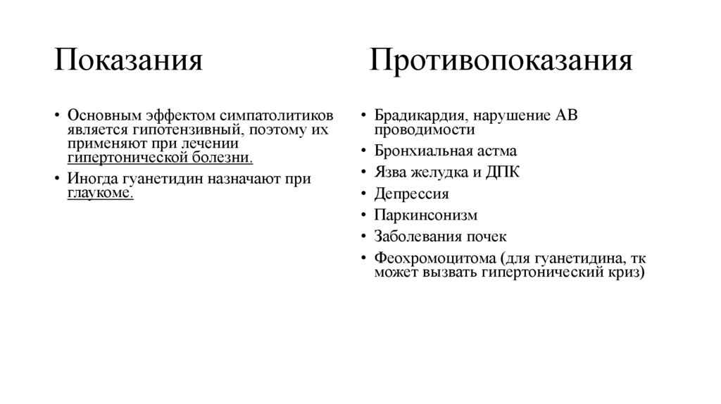 Показания• Основным эффектом симпатолитиков