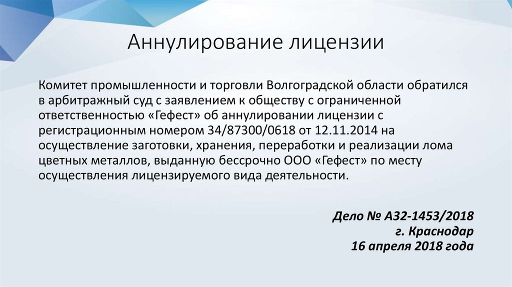 Аннулирование лицензииКомитет промышленности и торговли Волгоградской области обратился