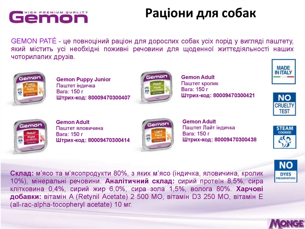 Раціони для собакGEMON PATÉ - це повноціний раціон для дорослих собак усіх порід у вигляді паштету,