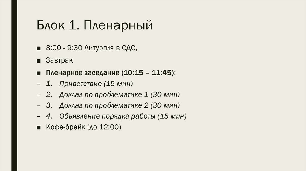 Блок 1. Пленарный■ 8:00 - 9:30 Литургия в СДС,