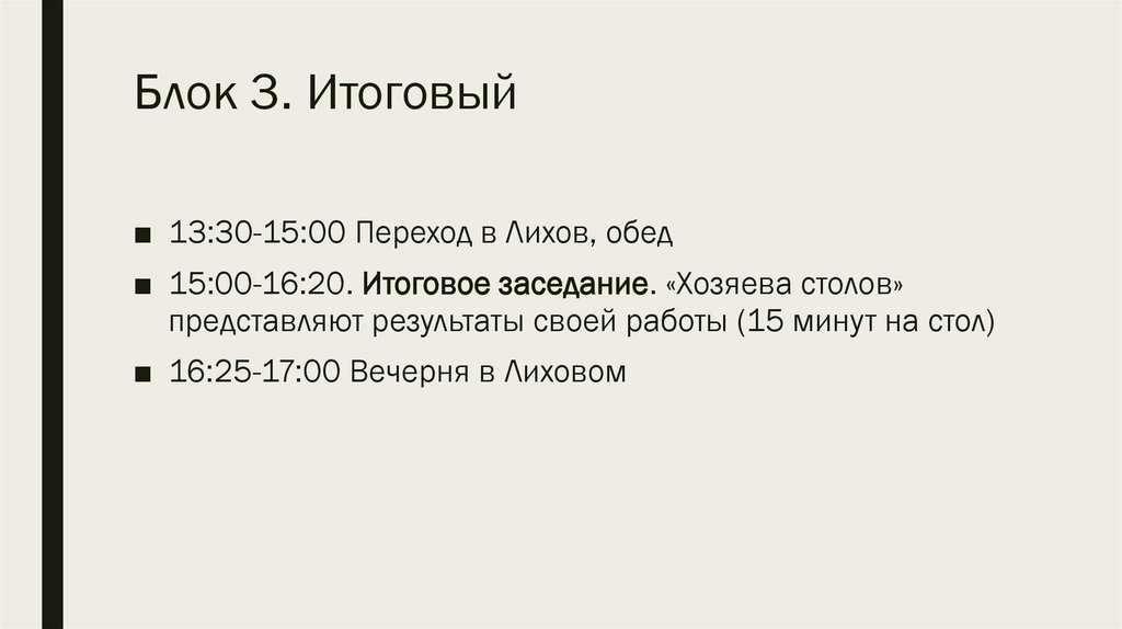 Блок 3. Итоговый■ 13:30-15:00 Переход в Лихов, обед
