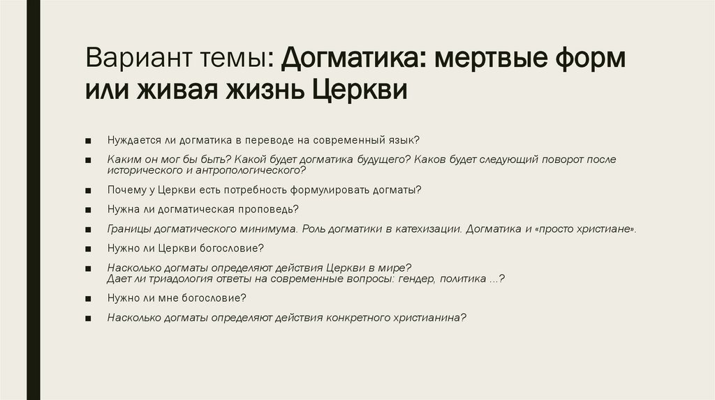 Вариант темы: Догматика: мертвые формили живая жизнь Церкви