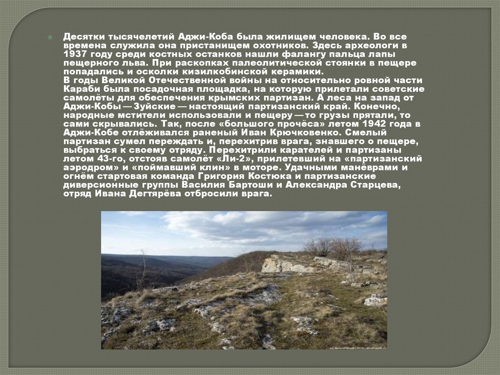 Десятки тысячелетий Аджи-Коба была жилищем человека. Во всевремена служила она пристанищем охотников. Здесь археологи в