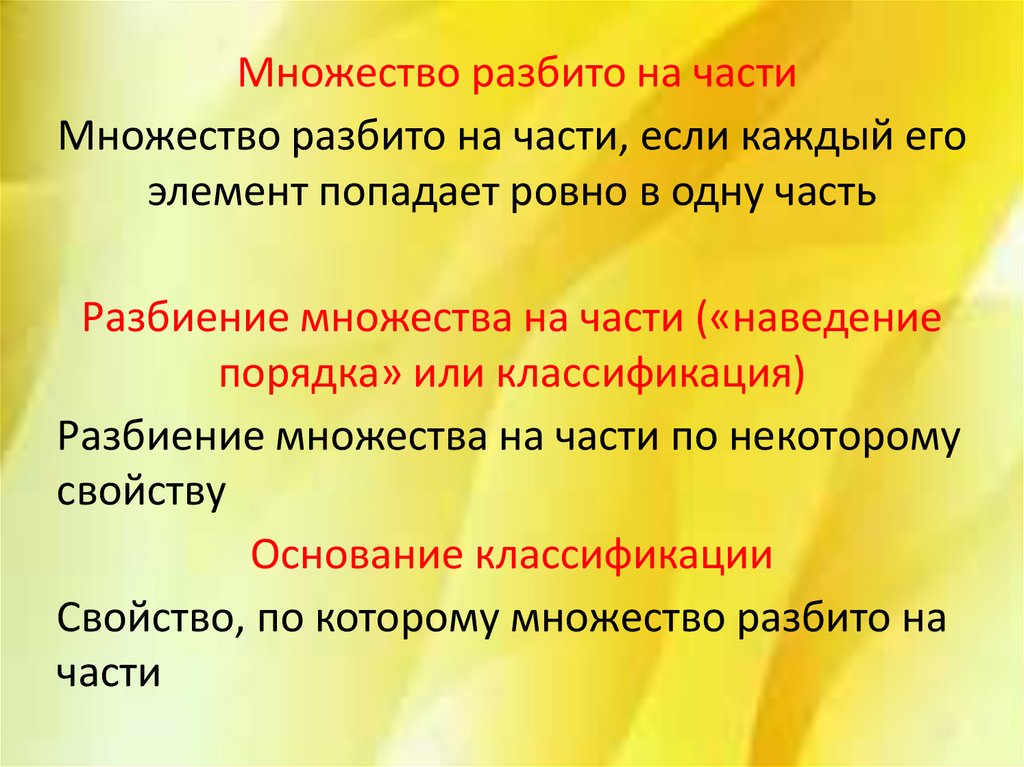 Множество разбито на частиМножество разбито на части, если каждый его