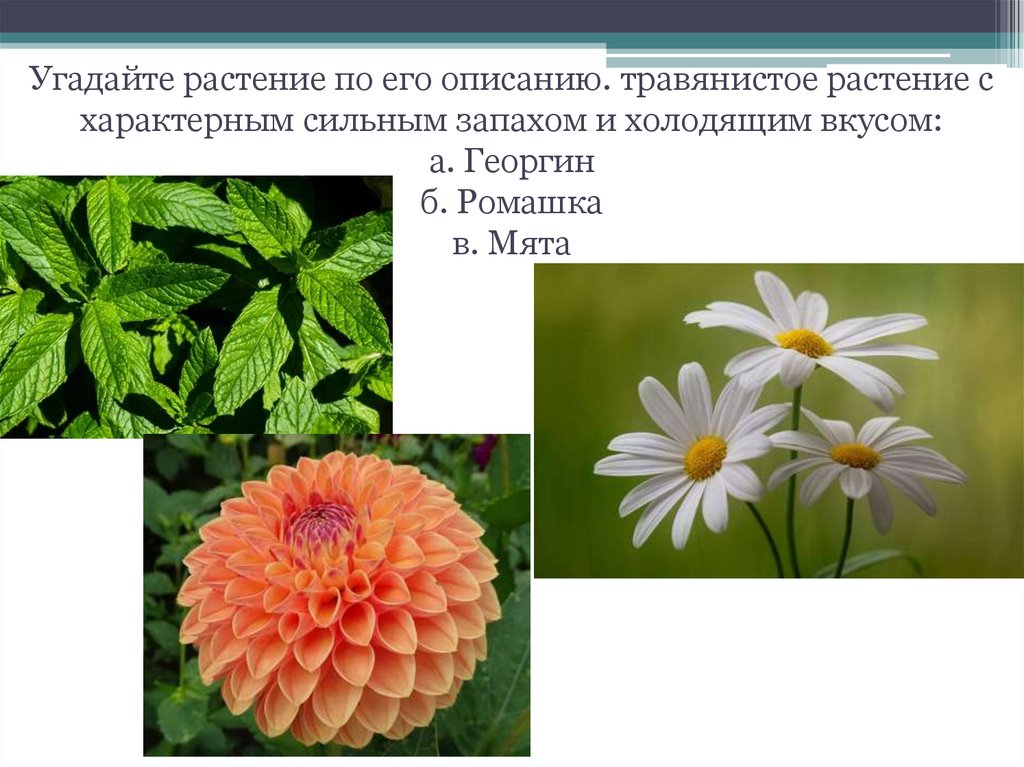 Угадайте растение по его описанию. травянистое растение схарактерным сильным запахом и холодящим вкусом: