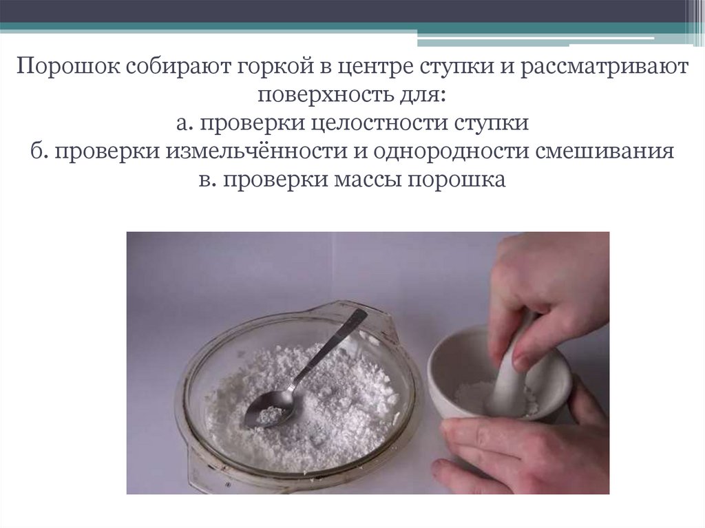 Порошок собирают горкой в центре ступки и рассматриваютповерхность для: