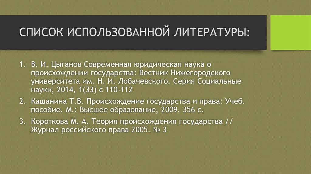 СПИСОК ИСПОЛЬЗОВАННОЙ ЛИТЕРАТУРЫ:1. В. И. Цыганов Современная юридическая наука о