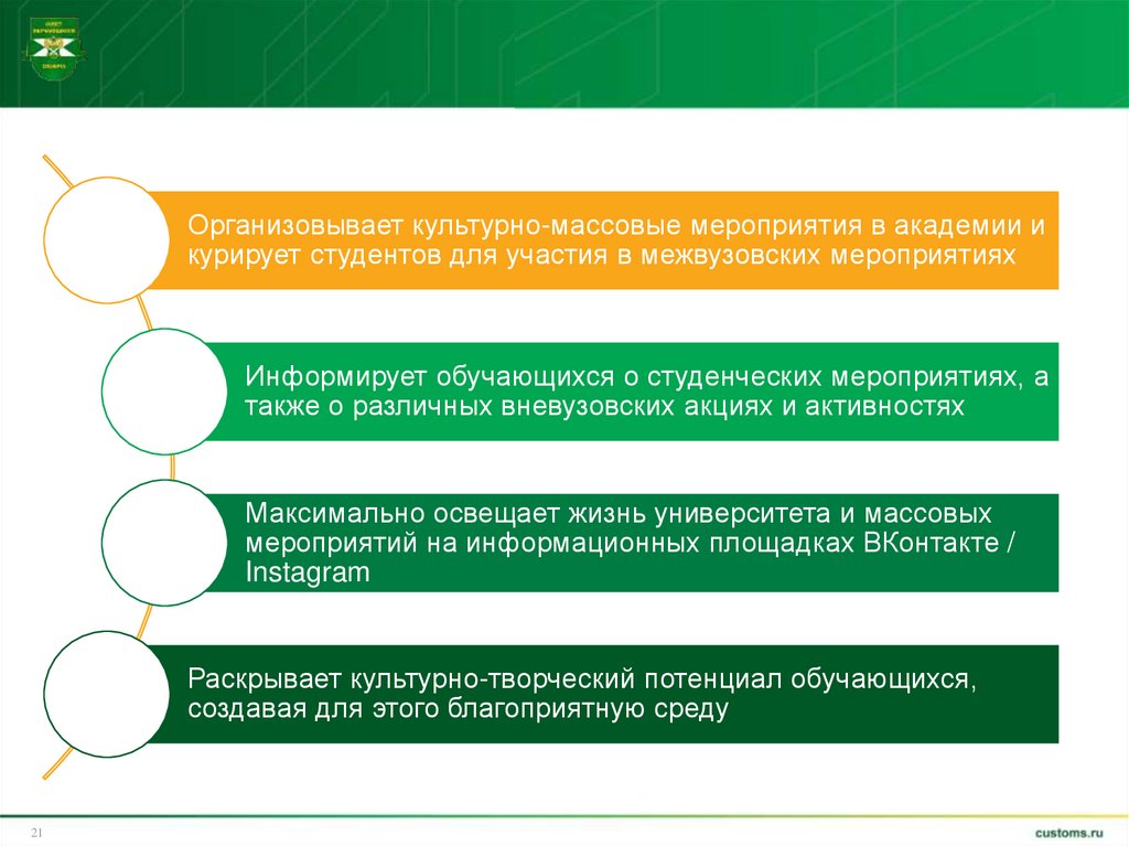Организовывает культурно-массовые мероприятия в академии икурирует студентов для участия в межвузовских мероприятиях