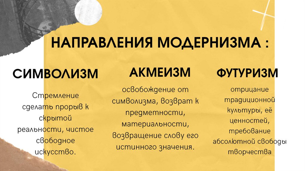 НАПРАВЛЕНИЯ МОДЕРНИЗМА :
