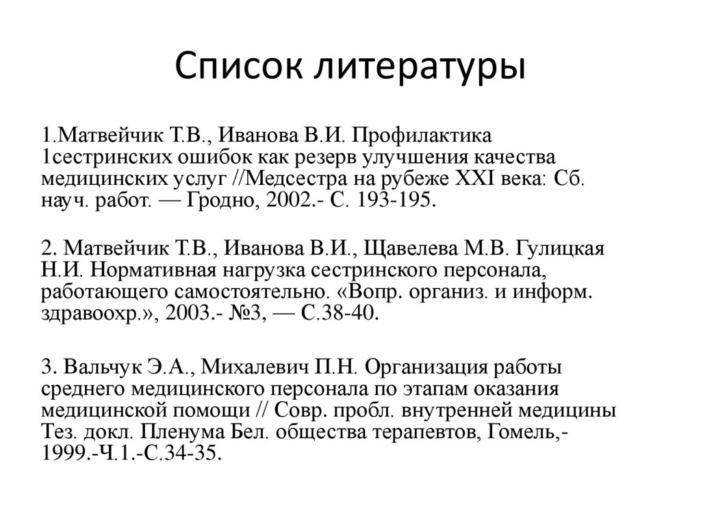 Список литературы1.Матвейчик Т.В., Иванова В.И. Профилактика