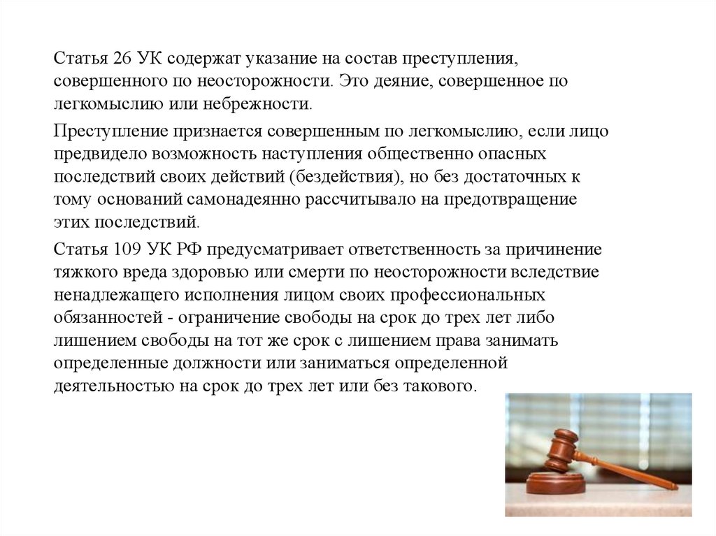 Статья 26 УК содержат указание на состав преступления,совершенного по неосторожности. Это деяние, совершенное по