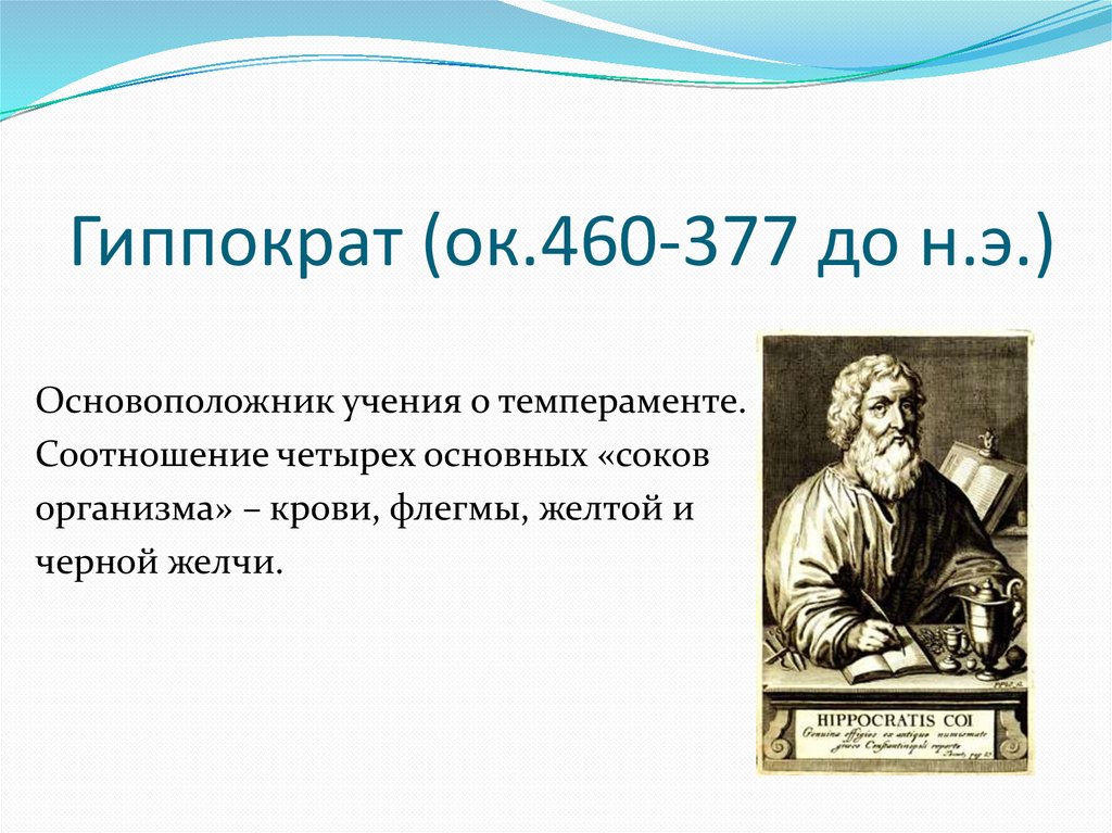 Гиппократ (ок.460-377 до н.э.)Основоположник учения о темпераменте.