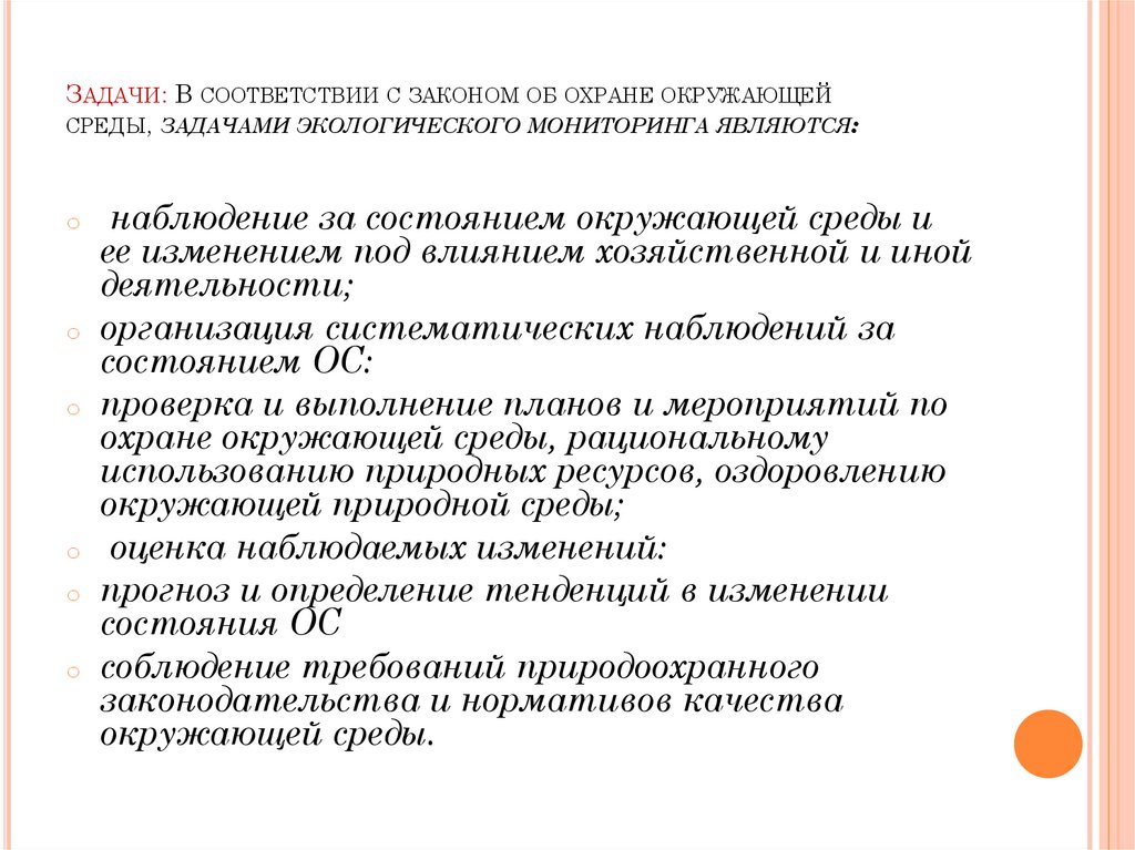 ЗАДАЧИ: В СООТВЕТСТВИИ С ЗАКОНОМ ОБ ОХРАНЕ ОКРУЖАЮЩЕЙСРЕДЫ, ЗАДАЧАМИ ЭКОЛОГИЧЕСКОГО МОНИТОРИНГА ЯВЛЯЮТСЯ: