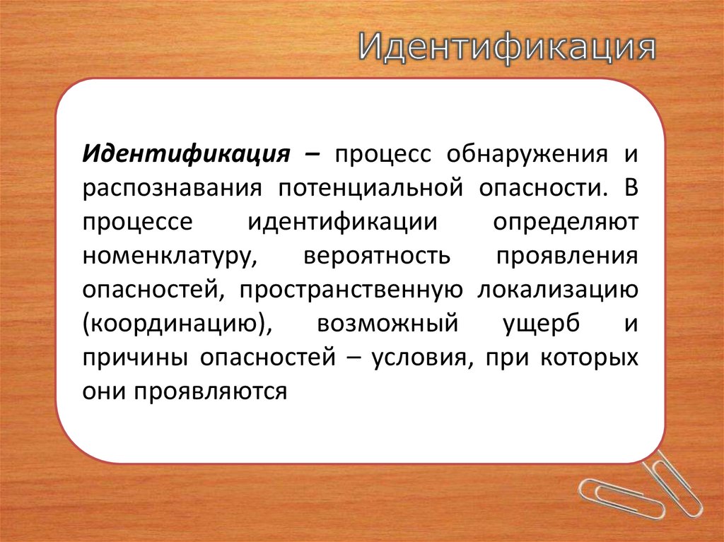 Идентификация – процесс обнаружения ираспознавания потенциальной опасности. В