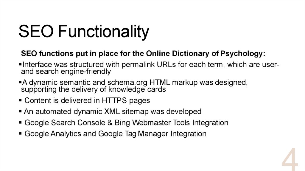 SEO FunctionalitySEO functions put in place for the Online Dictionary of Psychology: