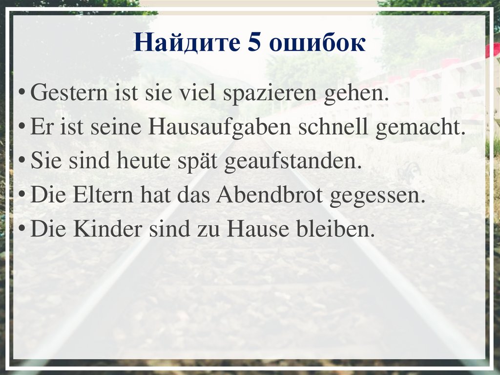 Найдите 5 ошибок• Gestern ist sie viel spazieren gehen.