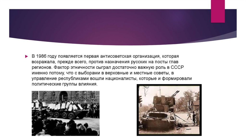 В 1986 году появляется первая антисоветская организация, котораявозражала, прежде всего, против назначения русских на посты глав