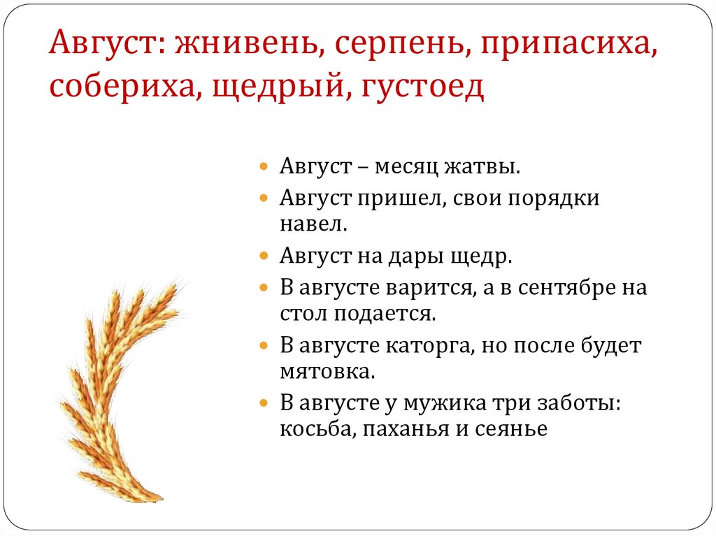 Август: жнивень, серпень, припасиха,собериха, щедрый, густоед