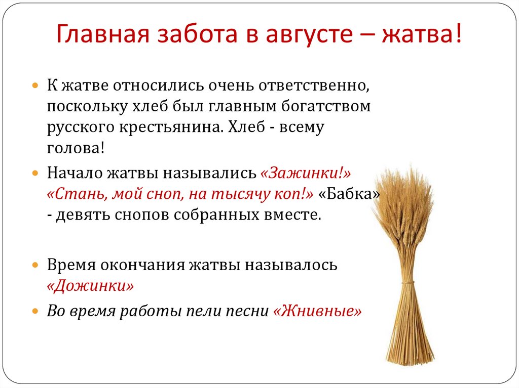 Главная забота в августе – жатва!К жатве относились очень ответственно,