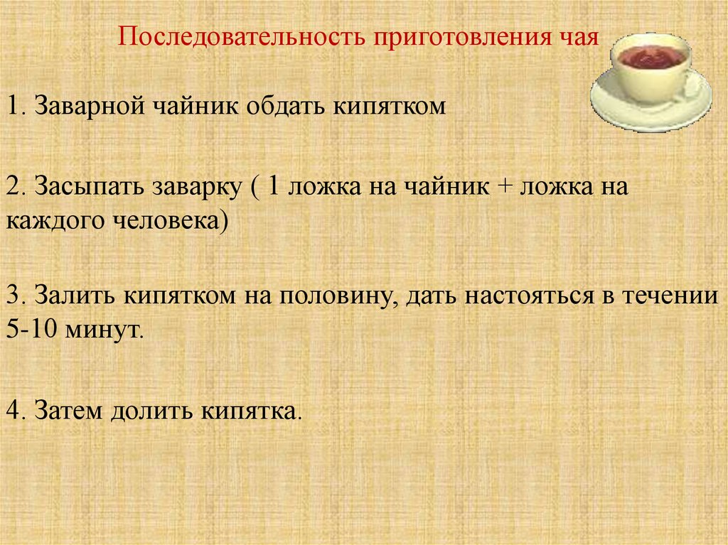Последовательность приготовления чая1. Заварной чайник обдать кипятком