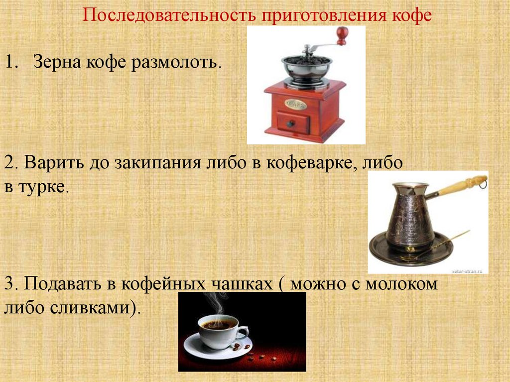 Последовательность приготовления кофе1. Зерна кофе размолоть.