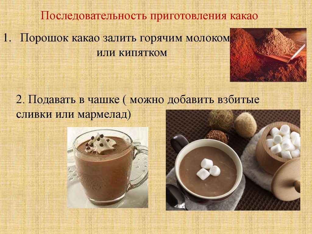 Последовательность приготовления какао1. Порошок какао залить горячим молоком