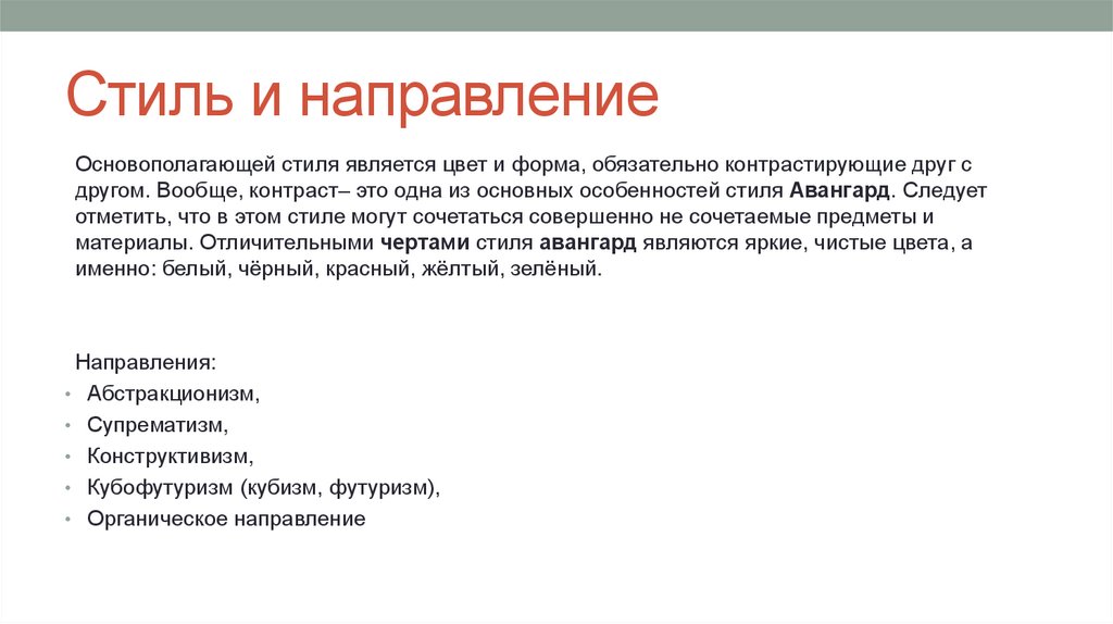 материалы. Отличительными чертами стиля авангард являются яркие, чистые цвета, а
