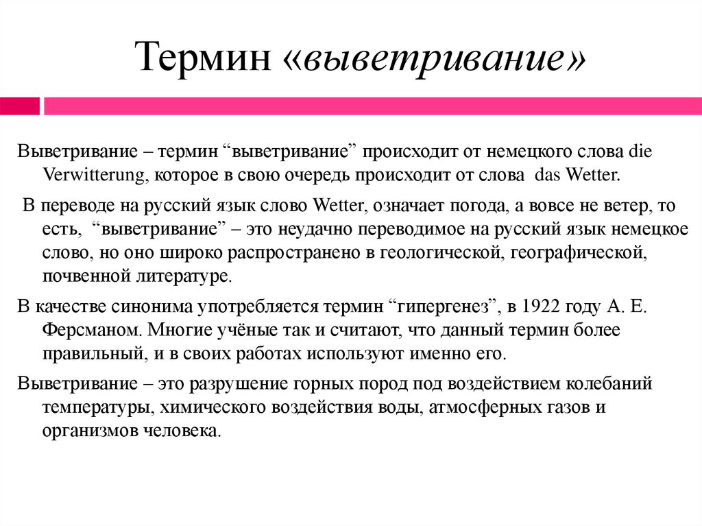 Термин «выветривание»Выветривание – термин “выветривание” происходит от немецкого слова die