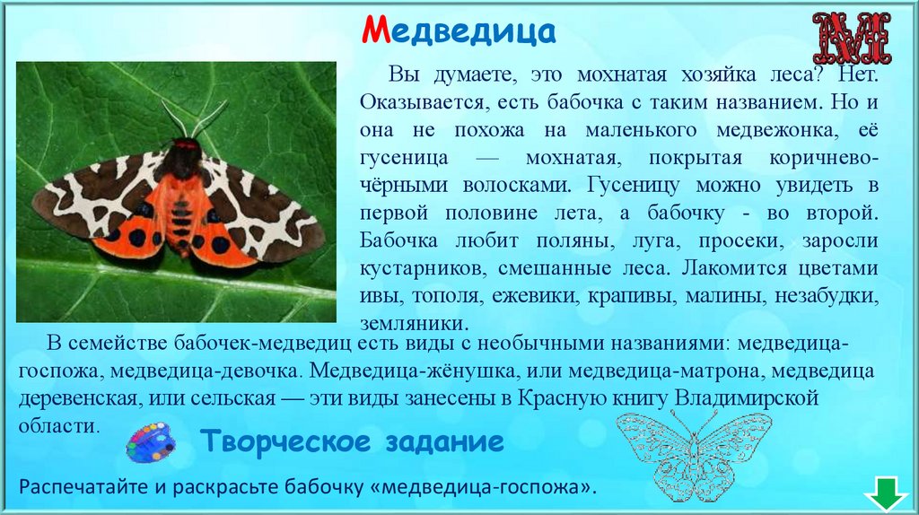 В семействе бабочек-медведиц есть виды с необычными названиями: медведицагоспожа, медведица-девочка. Медведица-жёнушка, или медведица-матрона, медведица