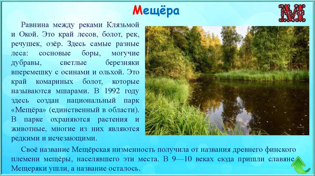 Своё название Мещёрская низменность получила от названия древнего финского