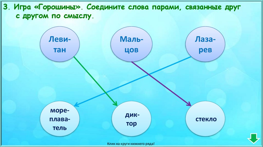 3. Игра «Горошины». Соедините слова парами, связанные другс другом по смыслу.