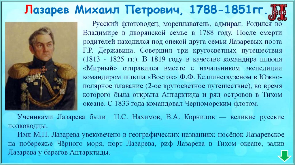 Лазарев Михаил Петрович, 1788-1851гг.Русский флотоводец, мореплаватель, адмирал. Родился во