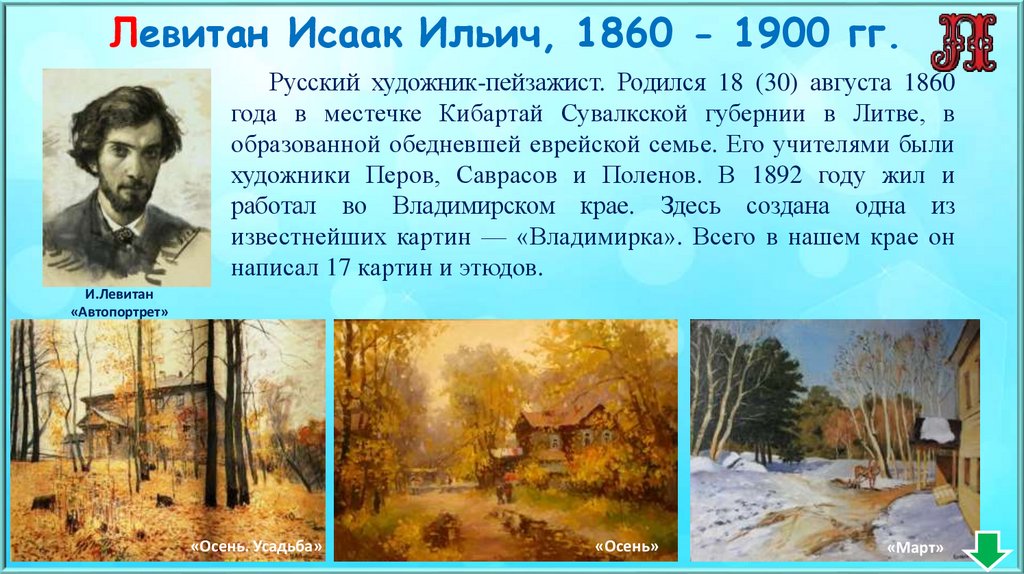 Левитан Исаак Ильич, 1860 - 1900 гг.Русский художник-пейзажист. Родился 18 (30) августа 1860