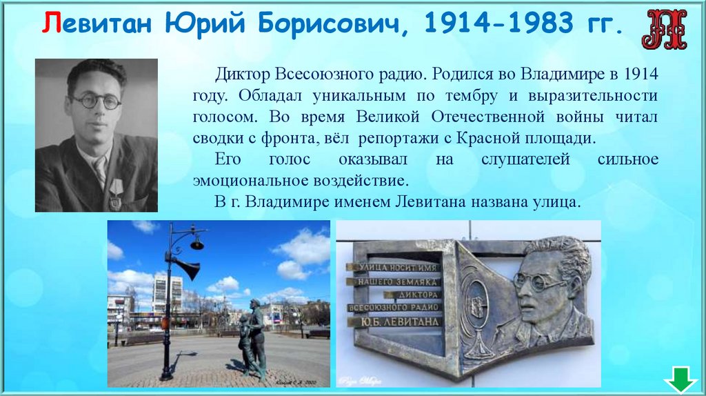 Левитан Юрий Борисович, 1914-1983 гг.Диктор Всесоюзного радио. Родился во Владимире в 1914