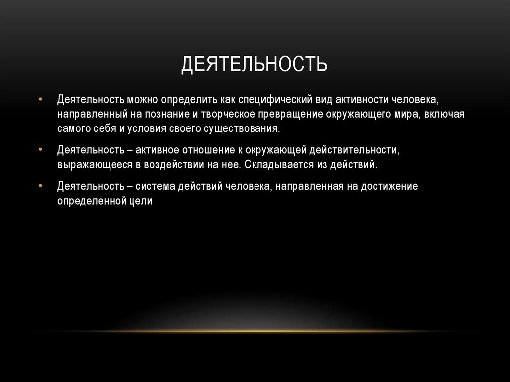 ДЕЯТЕЛЬНОСТЬДеятельность можно определить как специфический вид активности человека,