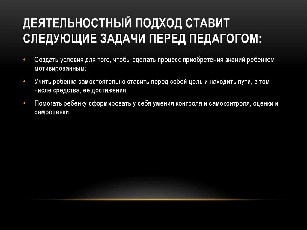 ДЕЯТЕЛЬНОСТНЫЙ ПОДХОД СТАВИТСЛЕДУЮЩИЕ ЗАДАЧИ ПЕРЕД ПЕДАГОГОМ: