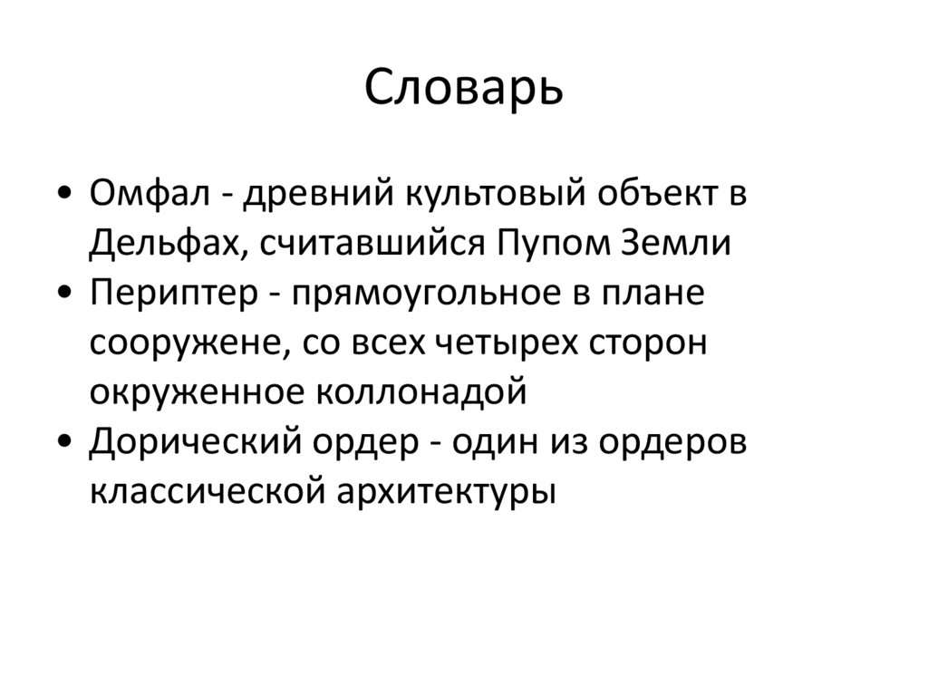 Словарь• Омфал - древний культовый объект в