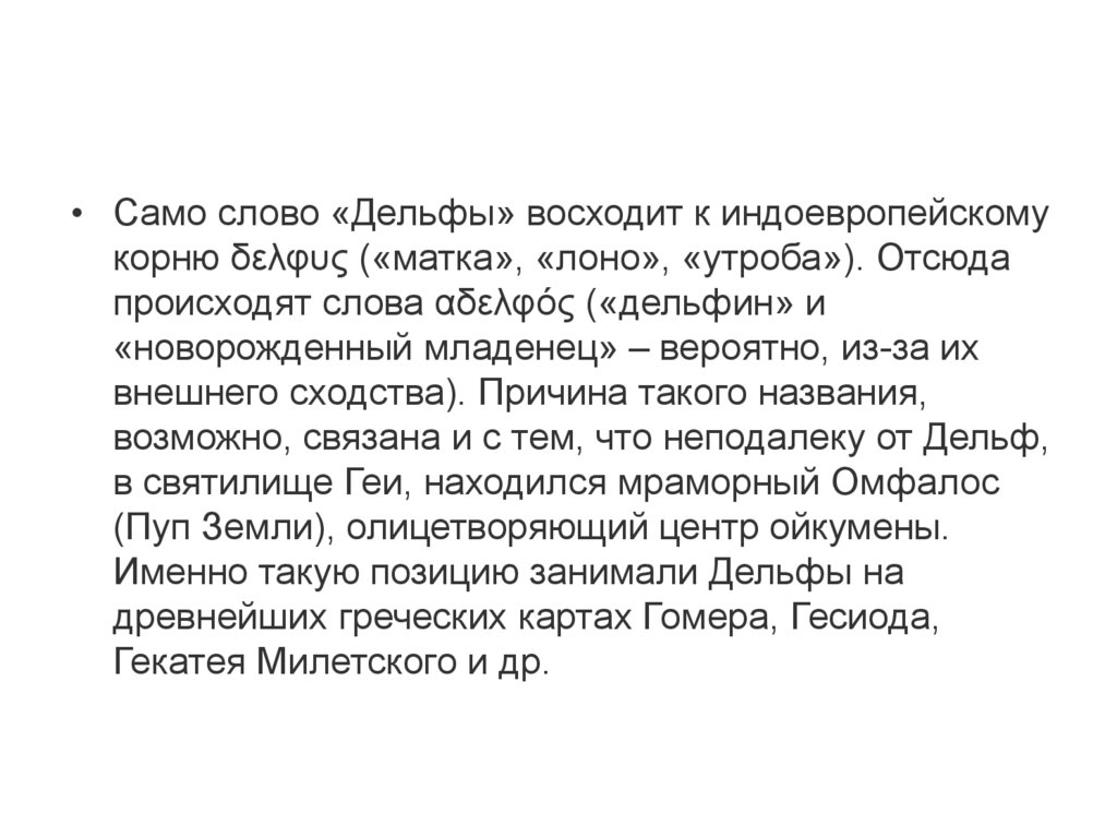 • Само слово «Дельфы» восходит к индоевропейскомукорню δελφυς («матка», «лоно», «утроба»). Отсюда