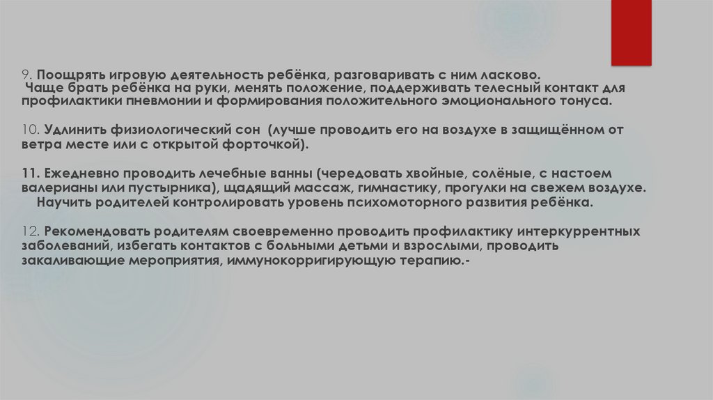 9. Поощрять игровую деятельность ребёнка, разговаривать с ним ласково.Чаще брать ребёнка на руки, менять положение, поддерживать телесный контакт для