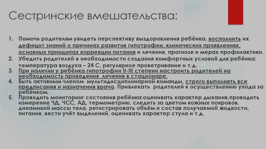 Сестринские вмешательства:1. Помочь родителям увидеть перспективу выздоровления ребёнка, восполнить их