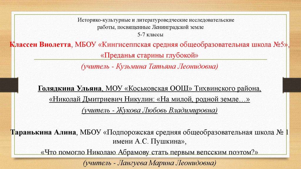 Историко-культурные и литературоведческие исследовательскиеработы, посвященные Ленинградской земле