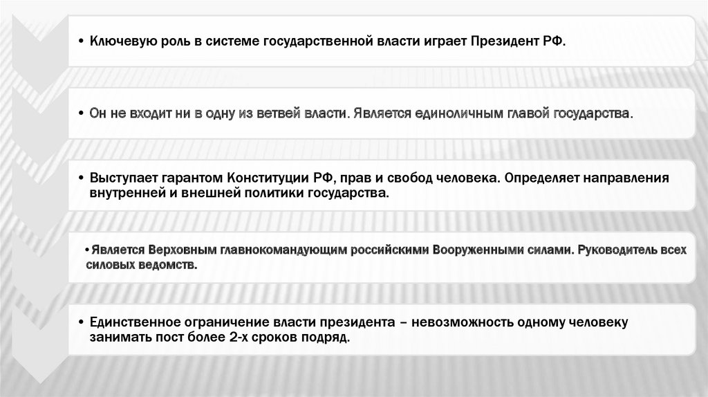 • Ключевую роль в системе государственной власти играет Президент РФ.• Он не входит ни в одну из ветвей власти. Является единоличным главой государства.