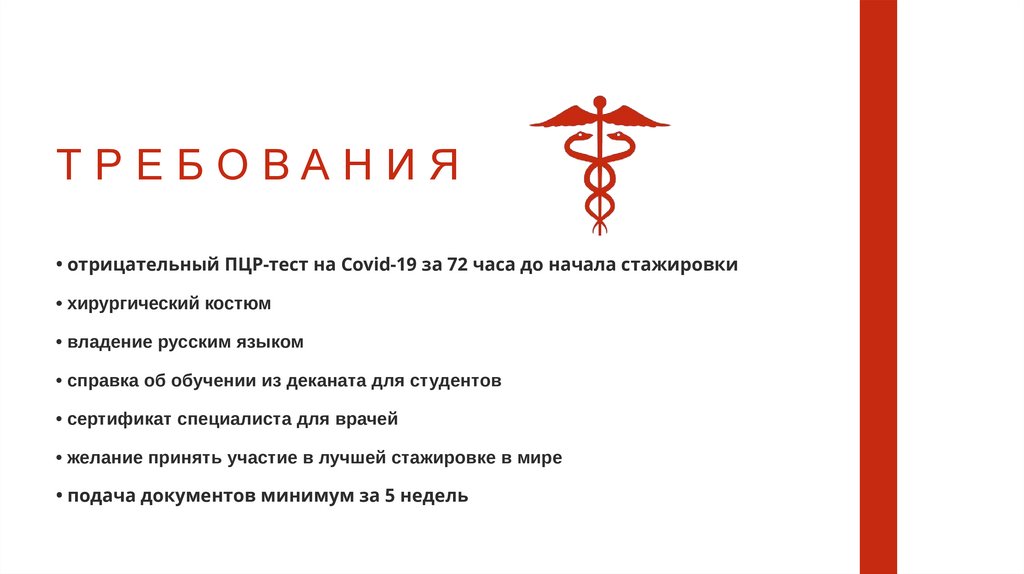 ТРЕБОВАНИЯ• отрицательный ПЦР-тест на Covid-19 за 72 часа до начала стажировки